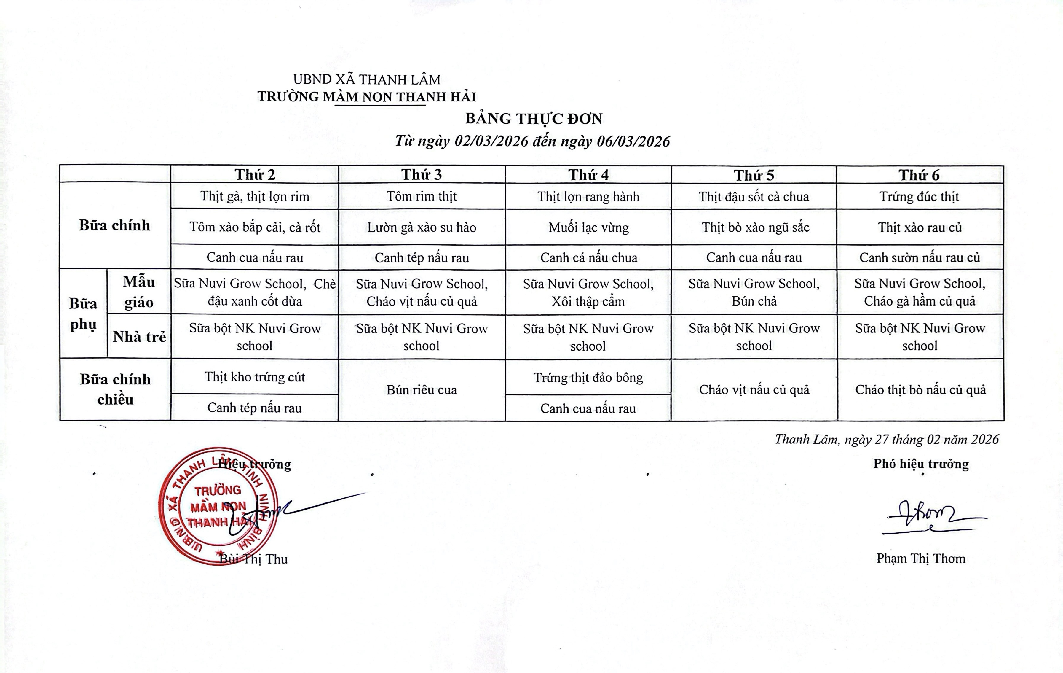 Thực đơn tuần 1 tháng 3 năm 2026 của trẻ